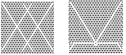 Modelován byl homogenní čtvercový vzorek rozdělený na 559 hmotných bodů situovaných do pravidelné, dokonale symetrické „trojúhelníkové“ sítě pružin. Při spodním okraji byl uchycen neposuvně v obou směrech; při horním okraji byl uchycen neposuvně v horizontálním směru, přičemž svislý posuv se měnil konstantní rychlostí. Úloha byla řešena s ohledem na kvalitativní hodnocení průběhu lomu. V závislosti na hodnotách parametrů interakční funkce vznikaly různé obrazce porušení, viz obr. 3 a 4.